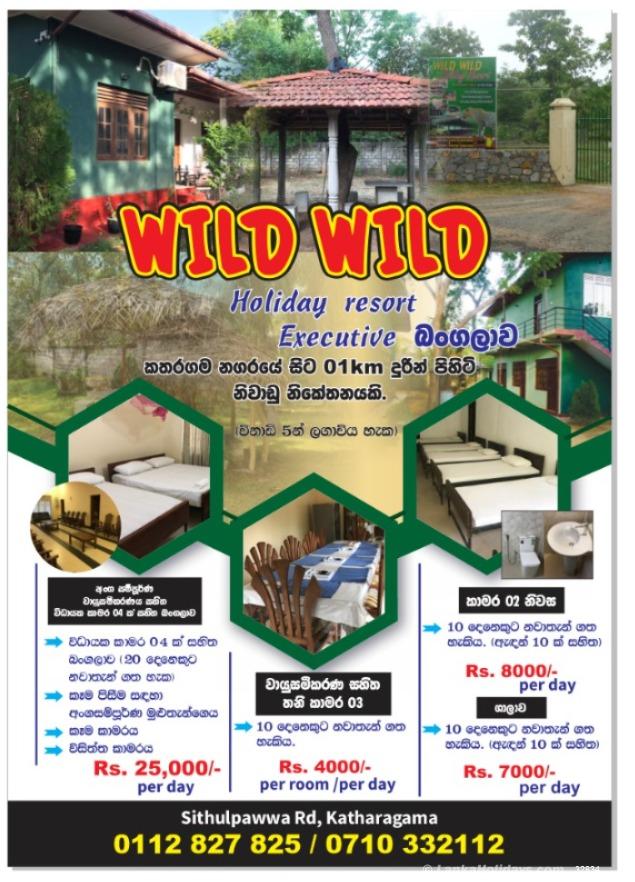 Wild Wild Holiday Bungalow at Situlpawwa Road, Kataragama for nature lovers with all amenities. A/C rooms with attached bathrooms. Cooking facilities also available.Ideal for those travelling to Kataragama, Yala National Park, “Wedasitikande”, Tissamaharama, Sithulpahuwa Ancient Monastery, Magulmahavihara Ruins, Galge National Park, Lunugamvehera National Park and Kirinda Rock Temple.01 Km to Kataragama Devalaya -15 minutes to the ‘Katagamuwa’ entrance of the Yala National Park, Yala safari vehicle service can be arranged under reasonable rates. RATES: