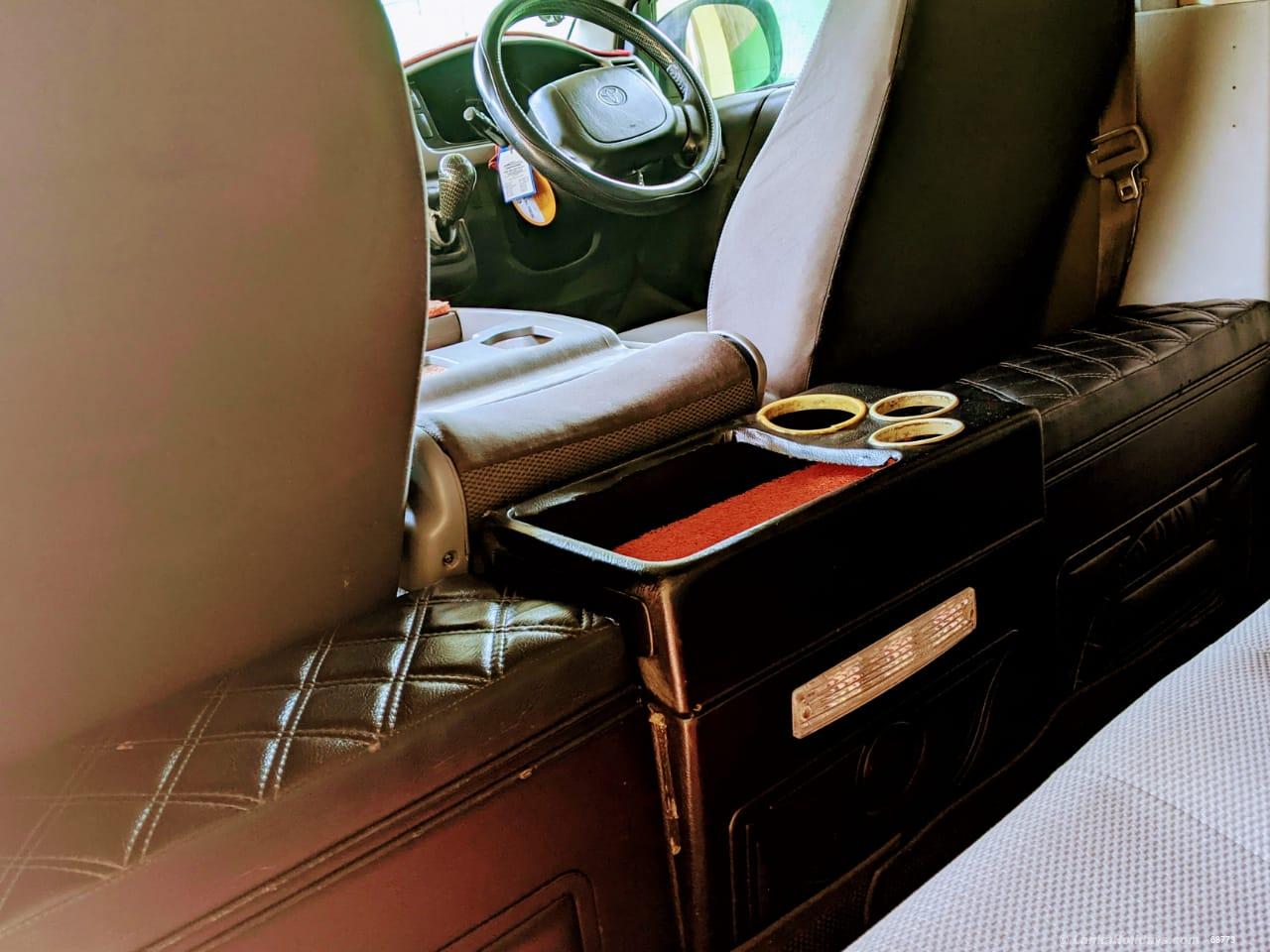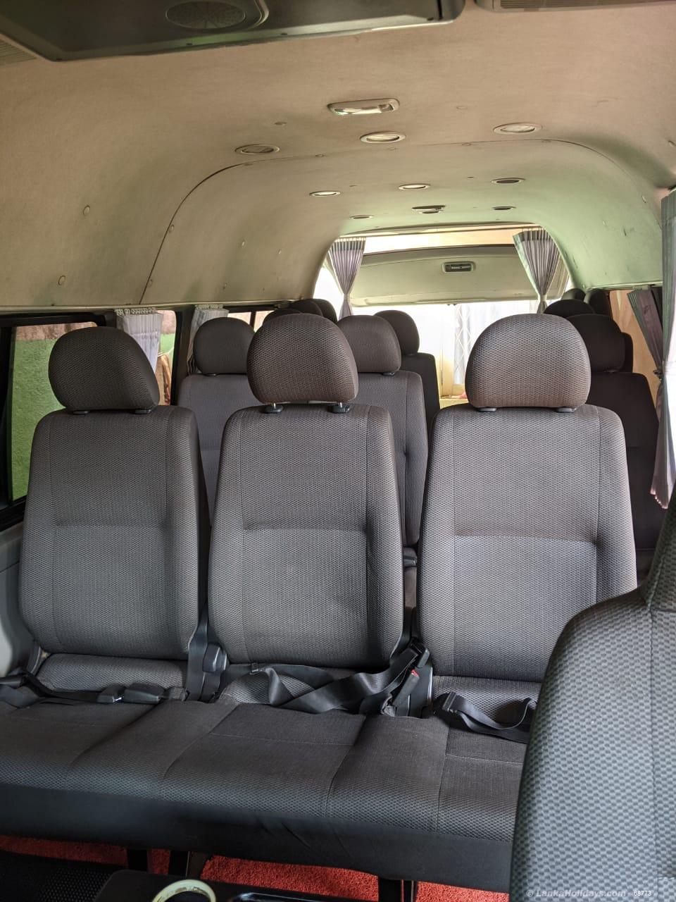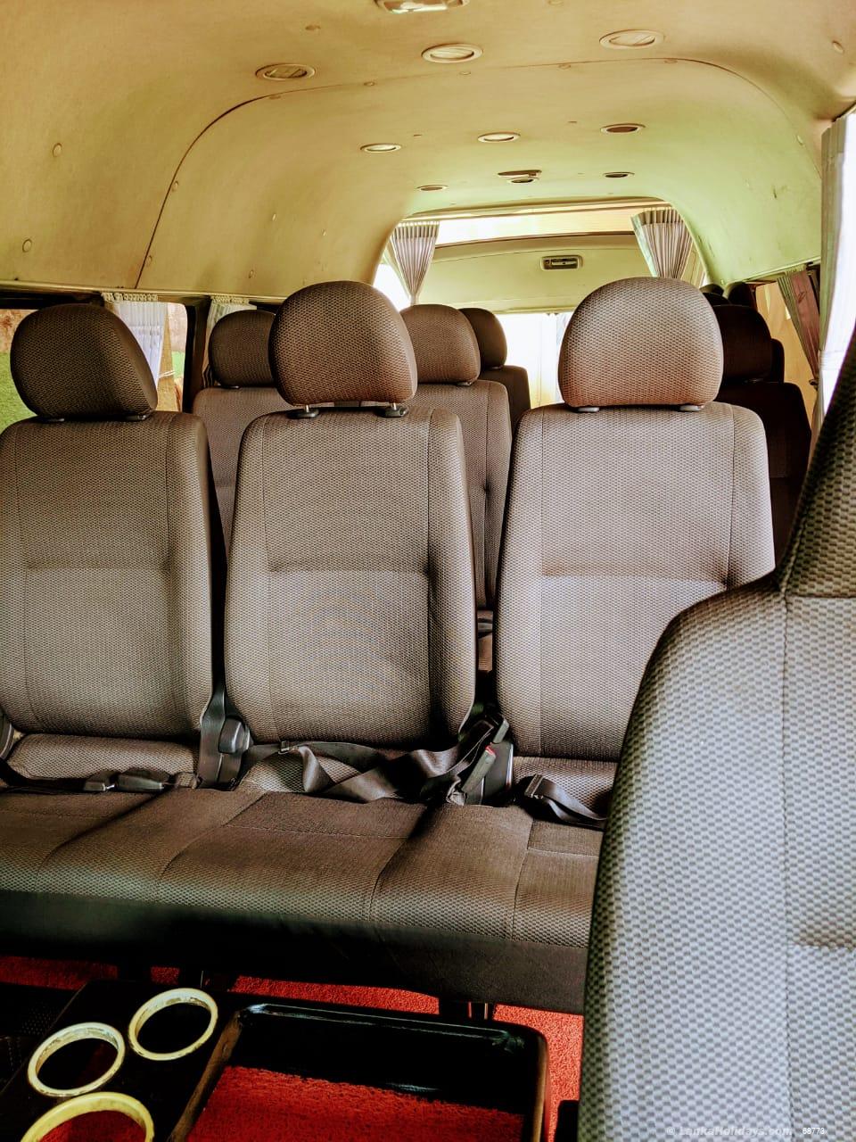 Toyota Hiace Ace (Hiace) KDH 222 Commuter - Box Model (super long-wide-high roof) 14 seater consisting of line AC, DVD/Stereo Setup, Overhead TV, Bluetooth, USB, aux player tinted glasses, etc. The rear cabin consists of original/brand new 14 individually adjustable bucket-type luxury passenger seats each complete with a headrest, safety belt, adjoining line AC outlet, and ample leg space.
